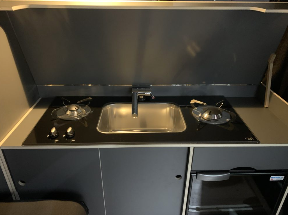 Vollausgestattet mit Kühlschrank, Gasherd, Spüle und grosszügigem Stauraum